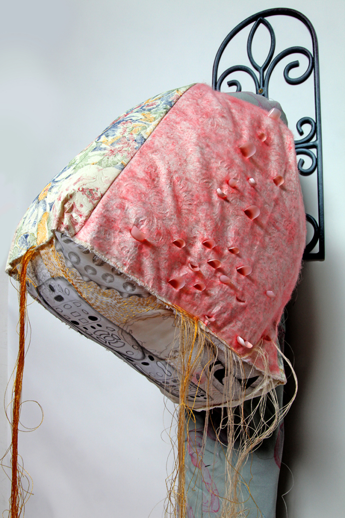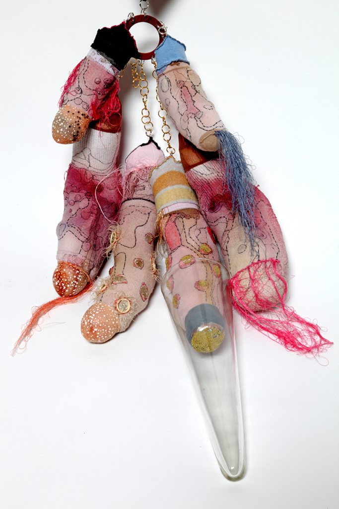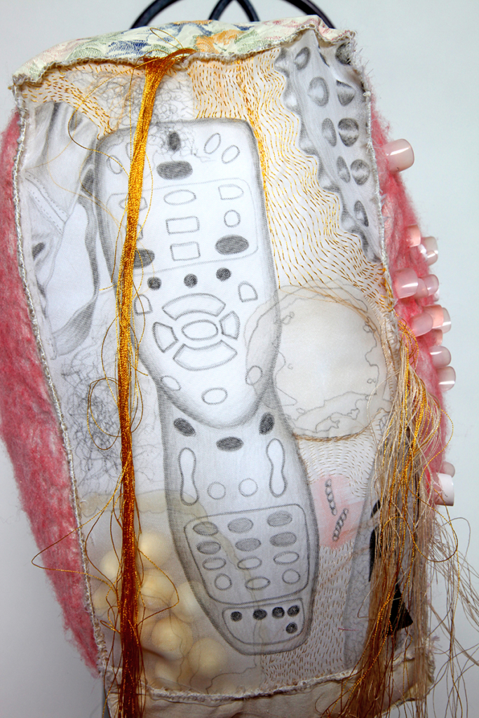 pencil and marker on sheer polyester, vinyl tablecloth, cotton and polyester thread, false fingernails, herbal tea, grape juice, air dry clay, socks, beads, rubber, glass vase, dental floss, nail polish