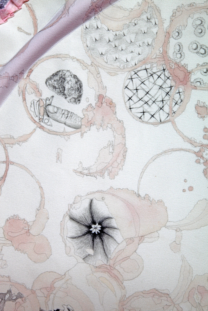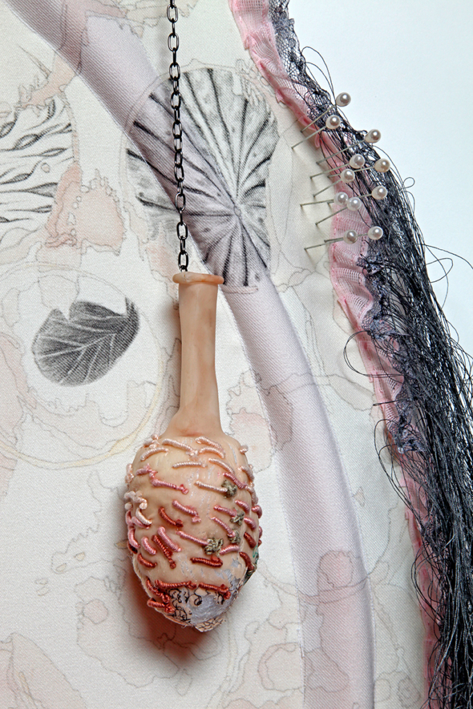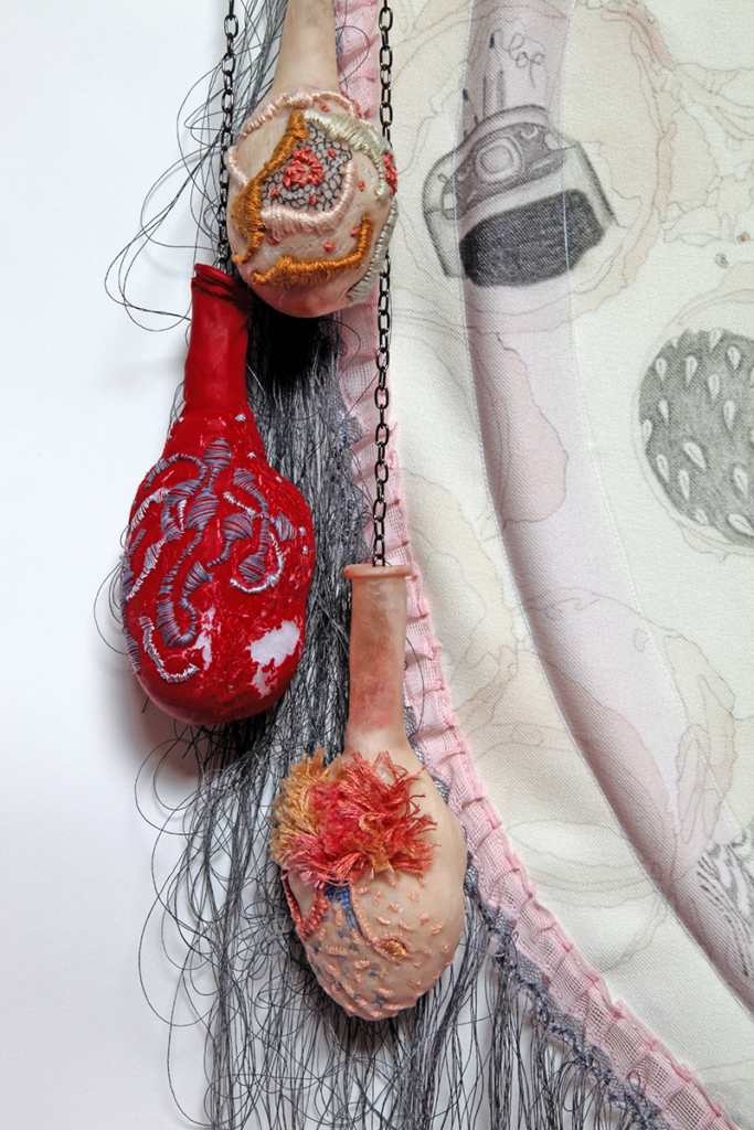 pencil and grape juice on polyester knit, embroidery floss, balloons, lace, marker, corsage pins, chain, cotton thread