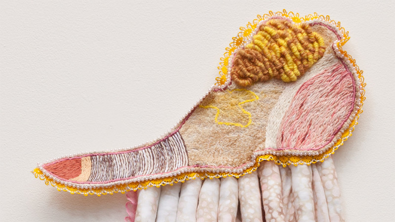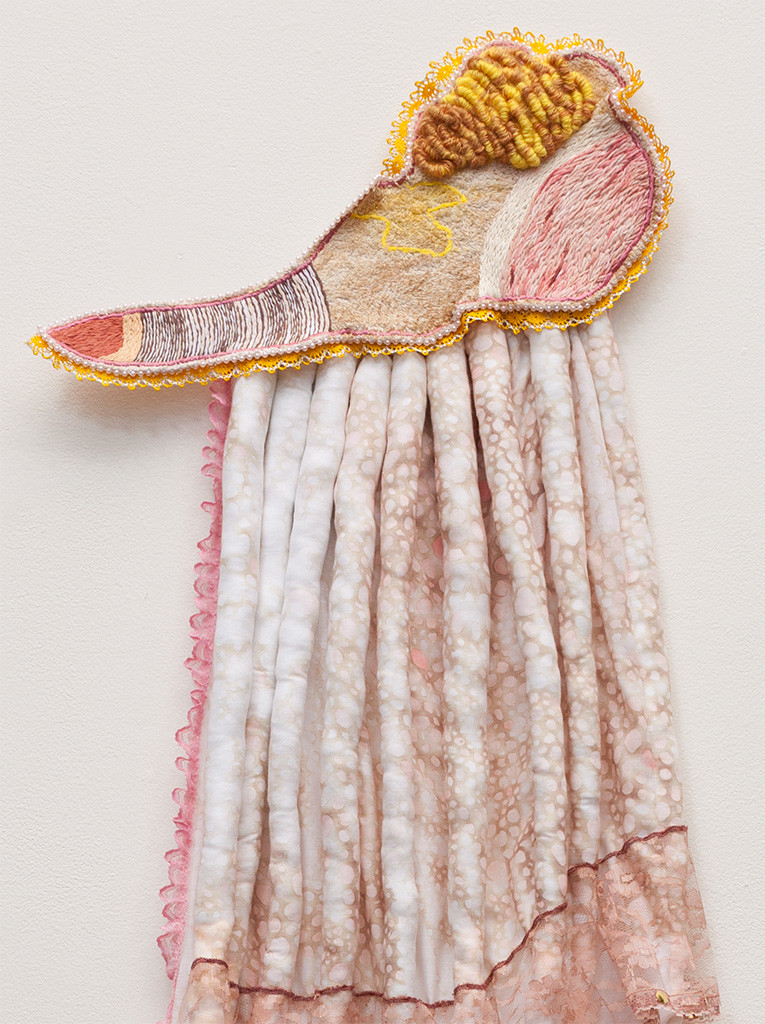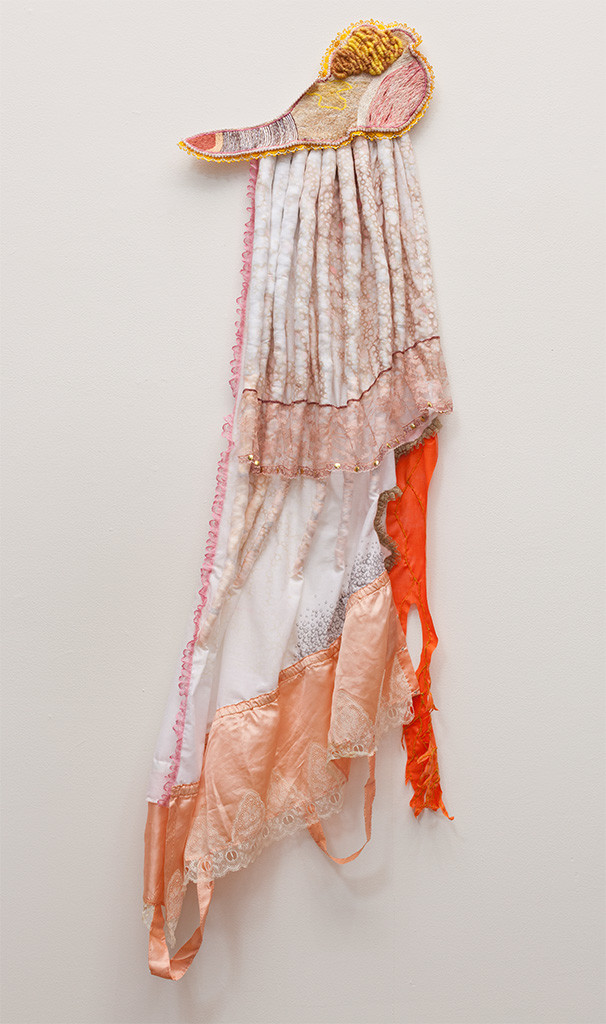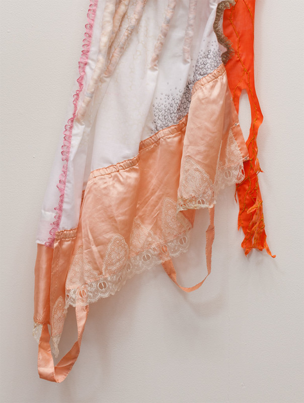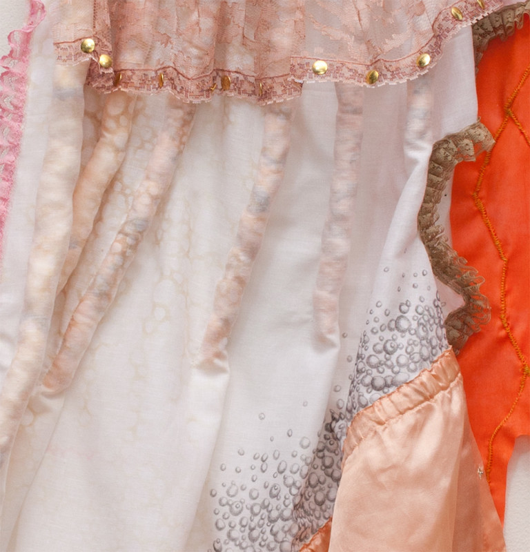 hand dyed embroidery floss, vintage lingerie, transfer ink, pencil, colored pencil, push pins, rubber, various trim