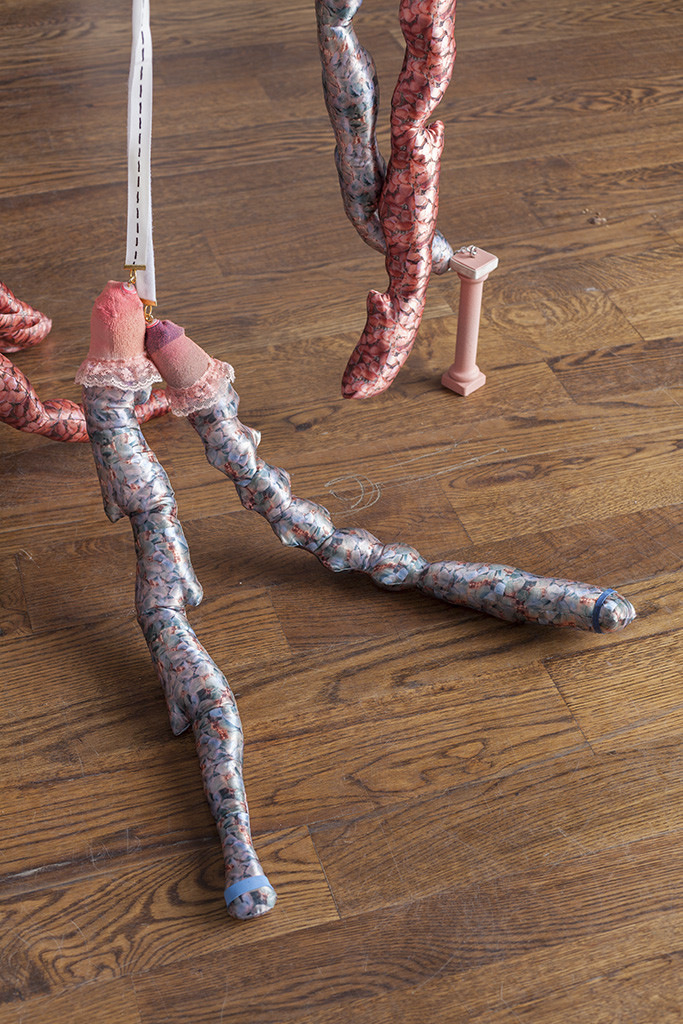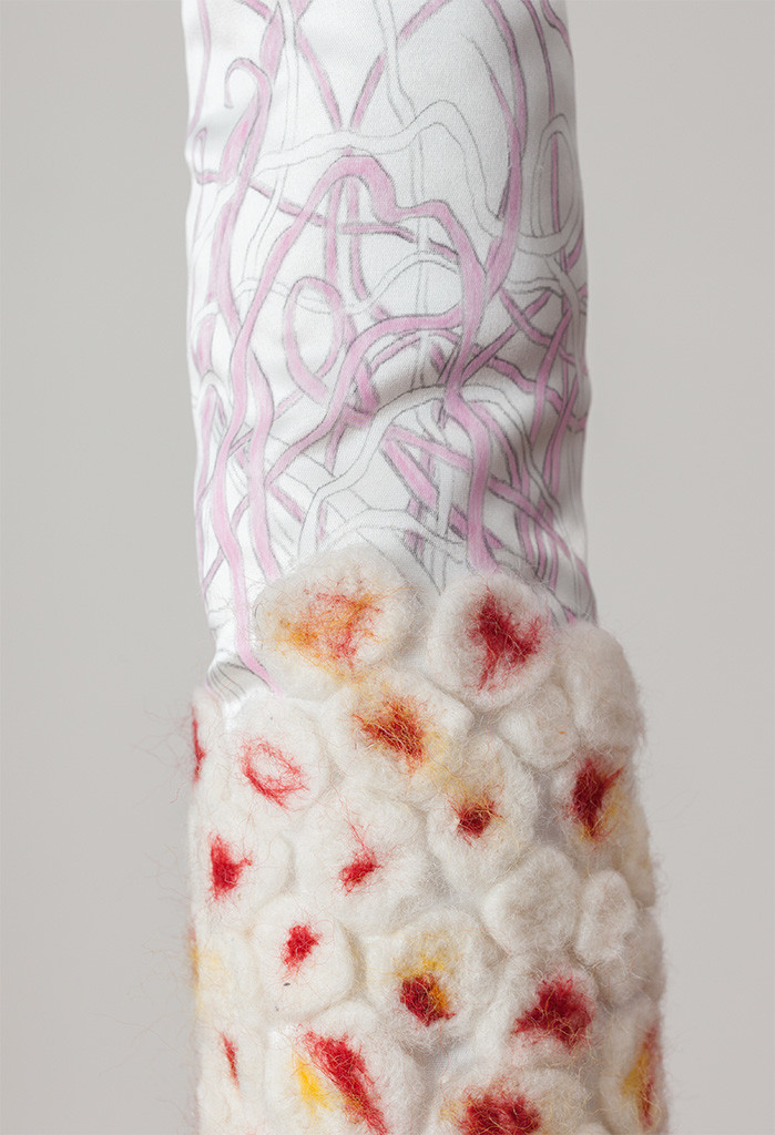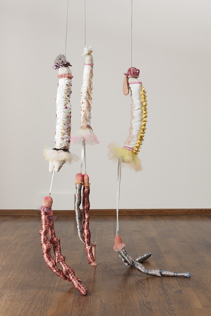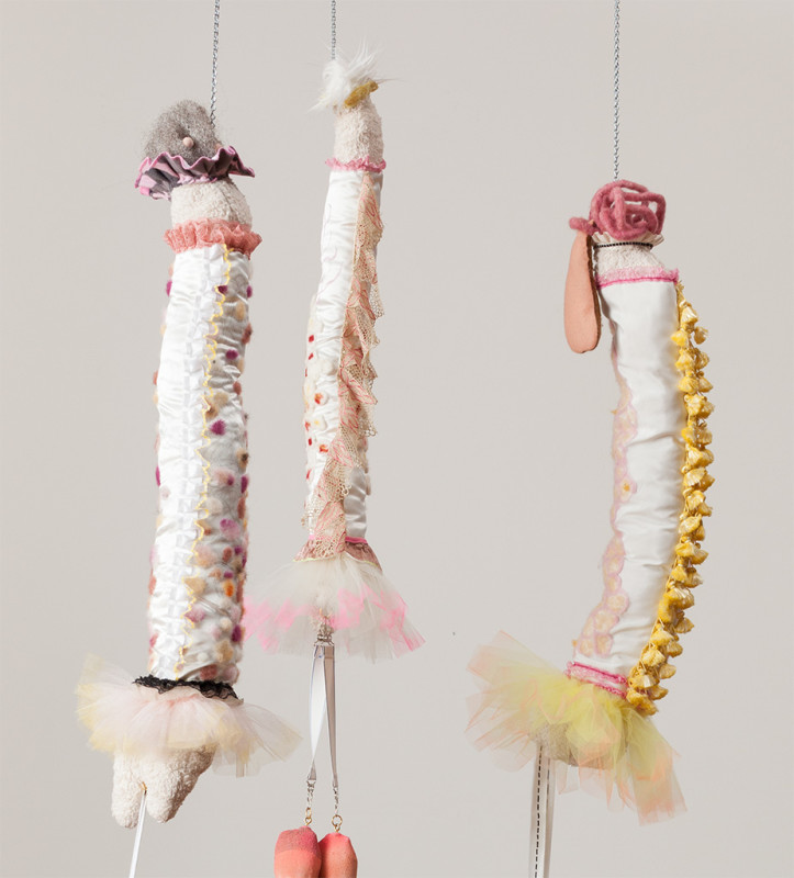 Felted satin, human hair, pencil, colored pencil, marker, tulle, custom printed satin, wood, Velcro, shoelaces, doll hair, socks, air dry clay, spray paint, various trim