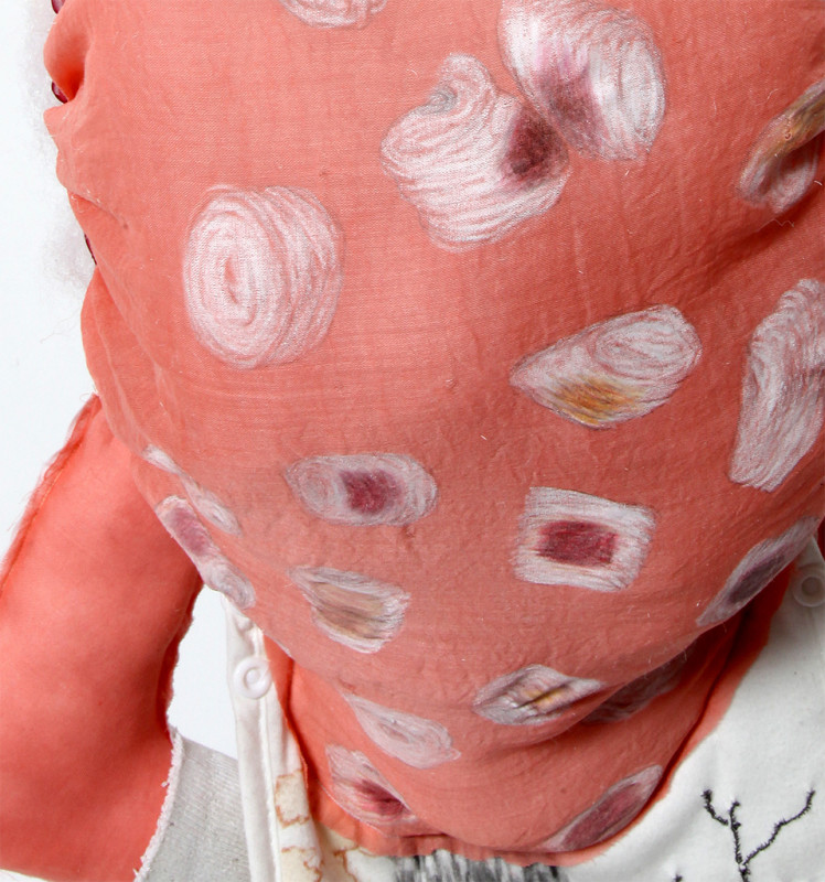 Pencil and colored pencil on polyester, sheer nylon, dyed cotton voile, cardboard, notebook paper, shoelaces, custom printed cotton voile, socks, chain mail, underwear elastic, hand-stitched bib, dyed Polyfil
