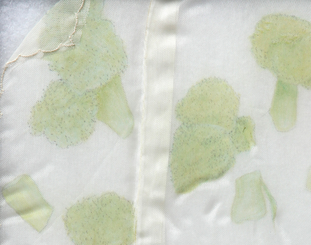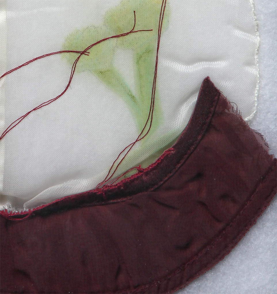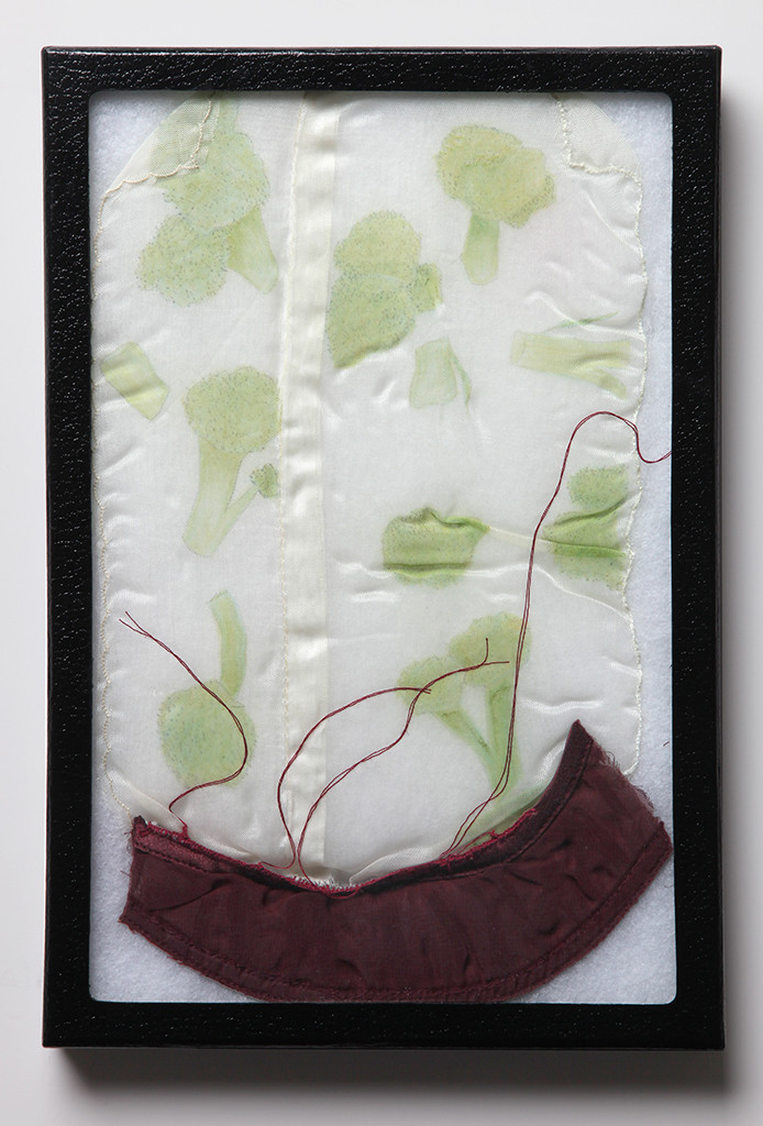 Pencil and colored pencil on sheer polyester, thread, found fabric, specimen box