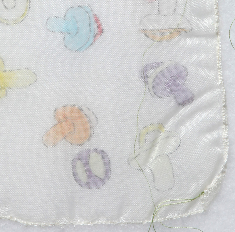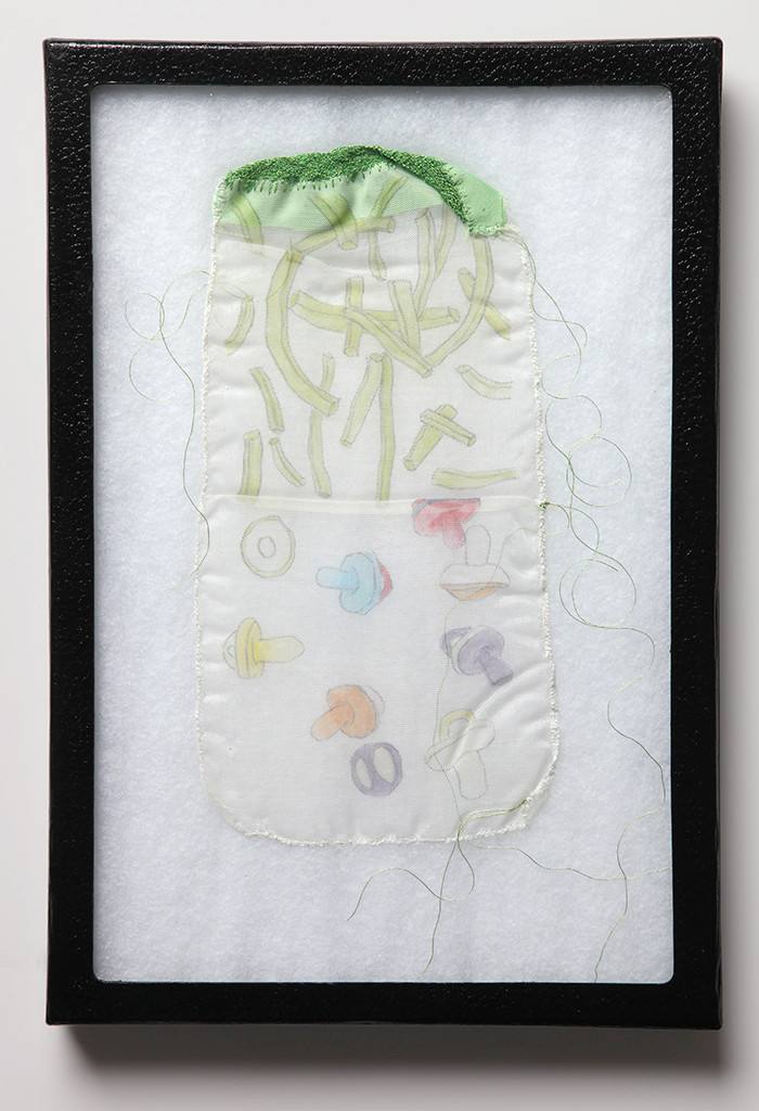 Pencil and colored pencil on sheer polyester, thread, found fabric, specimen box