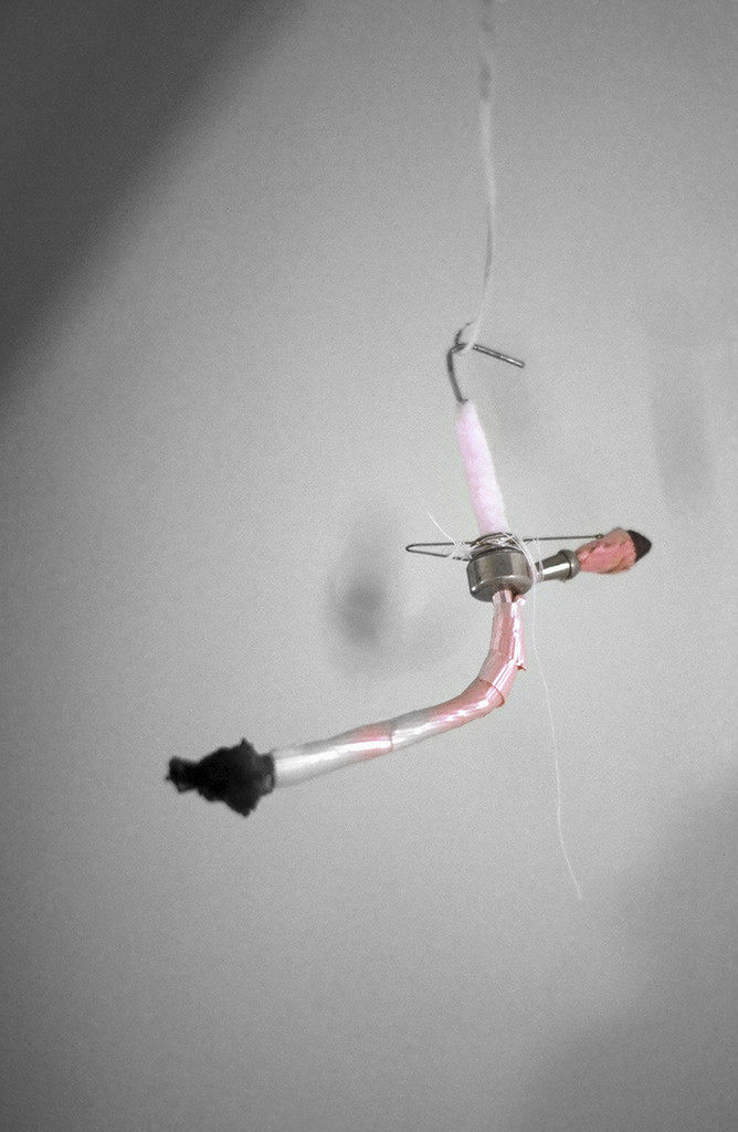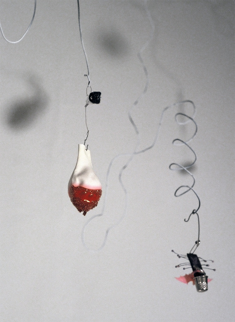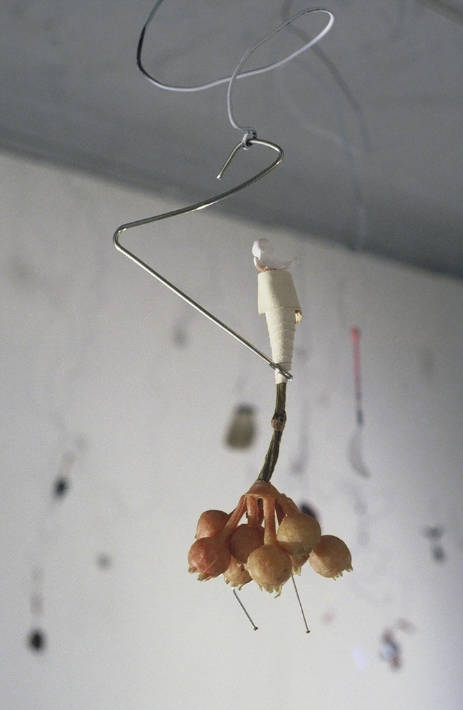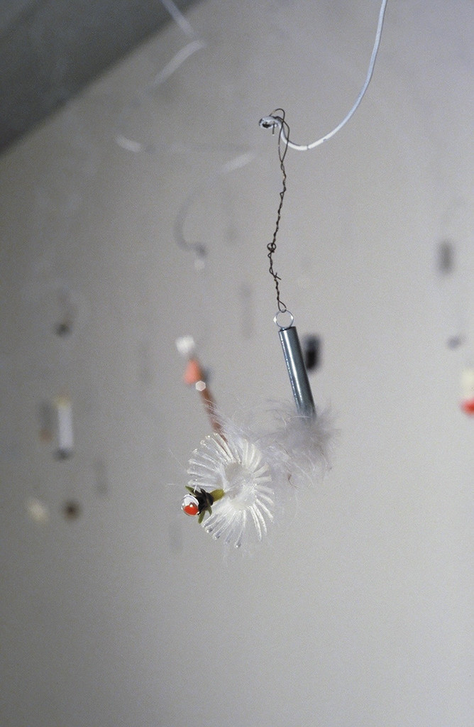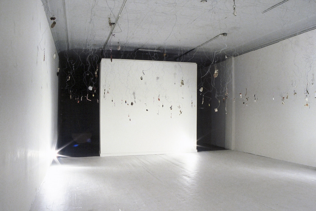100 mixed media objects hung with painted bailing wire. This installation consists of both unusual and everyday objects and materials with dramatic light and shadow. The placement of the objects at eye level makes them both a lure and an obstacle. Viewers interact with the objects directly by maneuvering around the work and indirectly by casting shadows in the room.