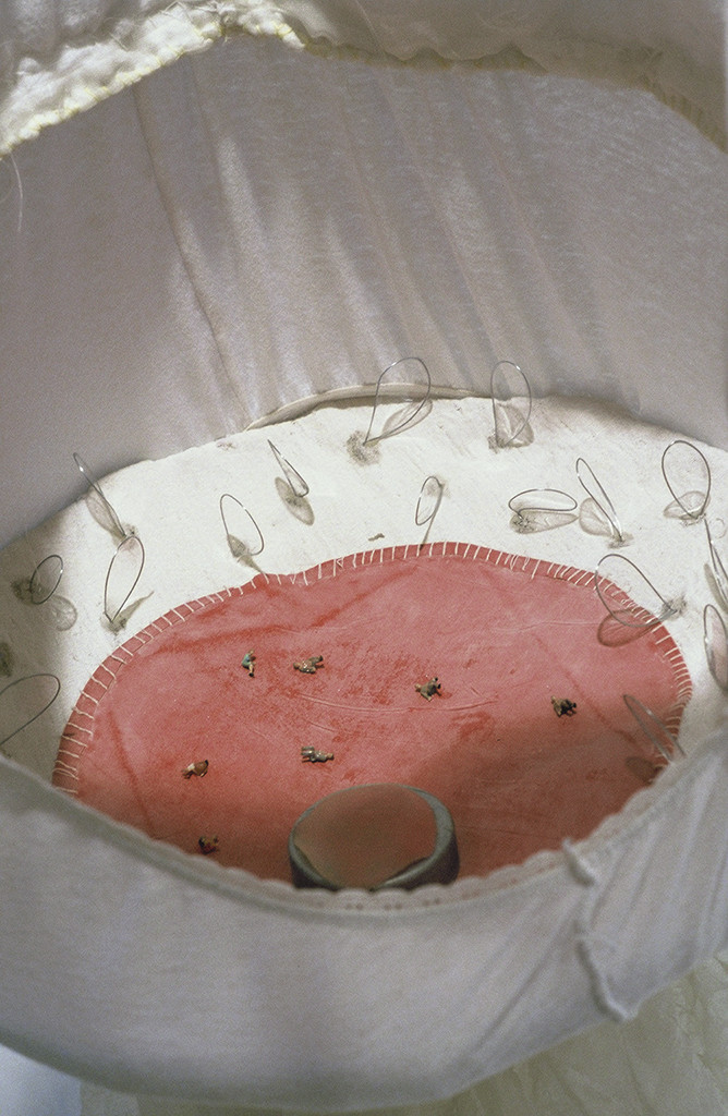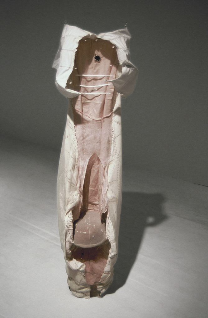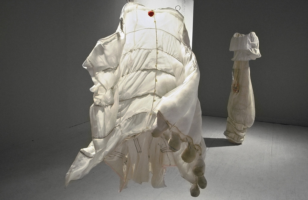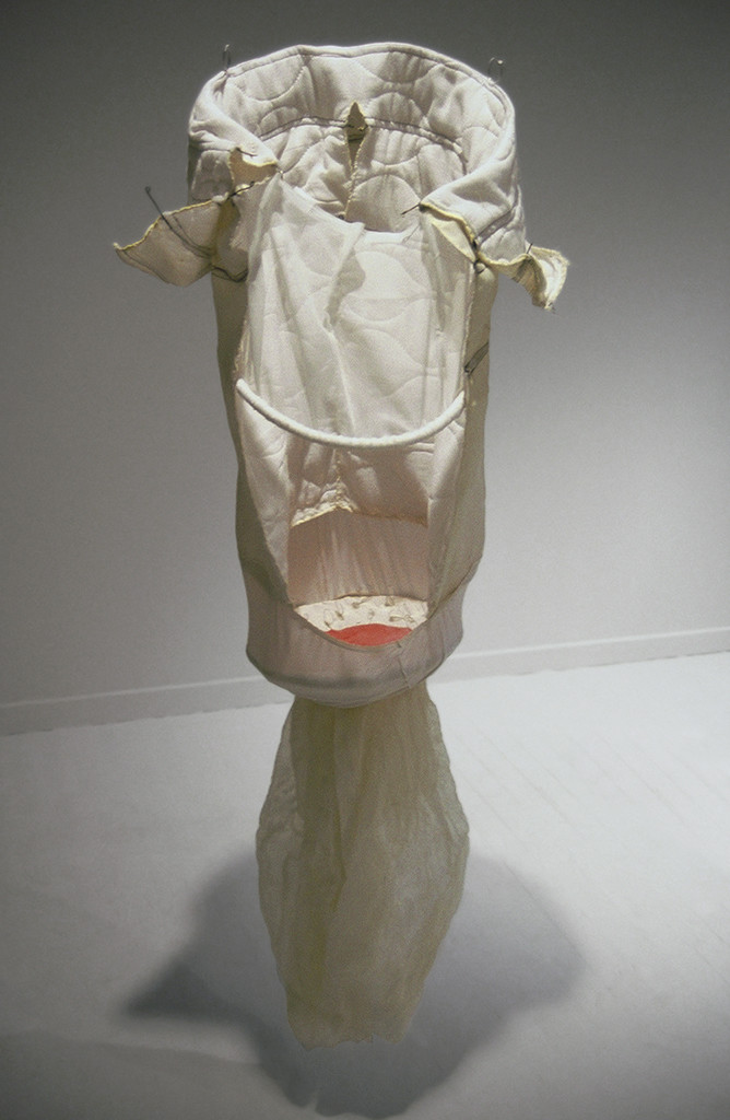 The word accessory has multiple meanings that reference being willingly or unwillingly part of a whole. Women are historically seen as an embellishment or supplement, sometimes participating in and sometimes absorbing this compartmentalization. This work consists of several costume-inspired forms made from household fabrics and throw-away objects. The forms within a dramatically-lit setting are meant to address female identity as contradictory and complicated but ultimately as fabrication.