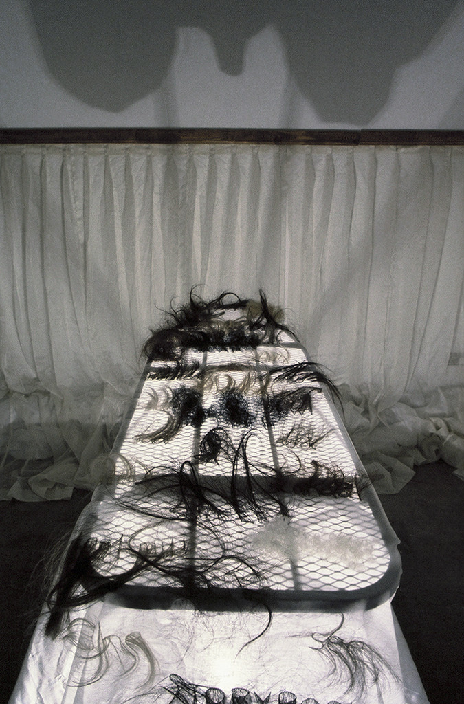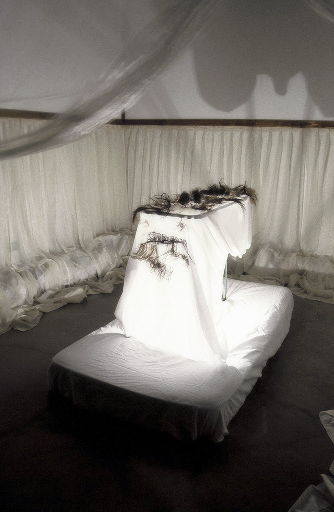 In She see see elements of the home and body are present but fetishized and reconstructed somewhere between alter and stage. The ironing board as a symbol of domesticity transforms into a fantastical form in an alternate existence, both dangerous and whimsical. Sloughed hair that is normally formless and reviled sprouts as text. Vaguely obscene shadows mark the walls, recalling theatrical shadow play and nighttime fears. The displaced familiarity encourages the viewer to consider whether they are meant to worship or be entertained.