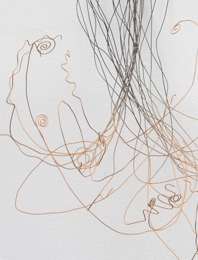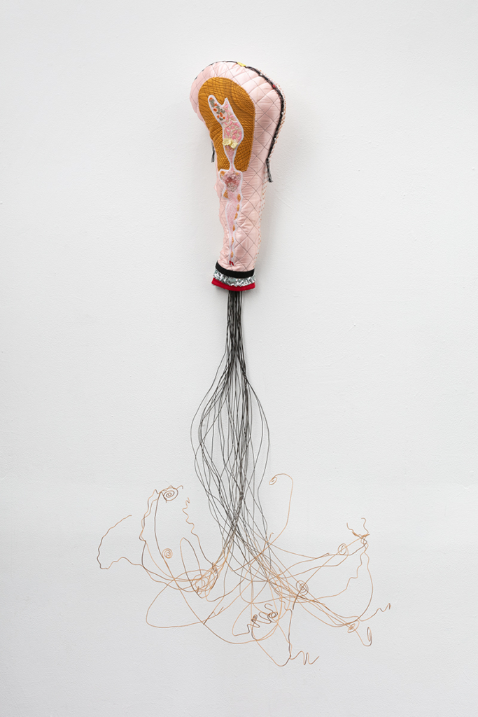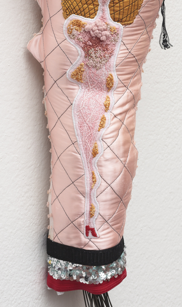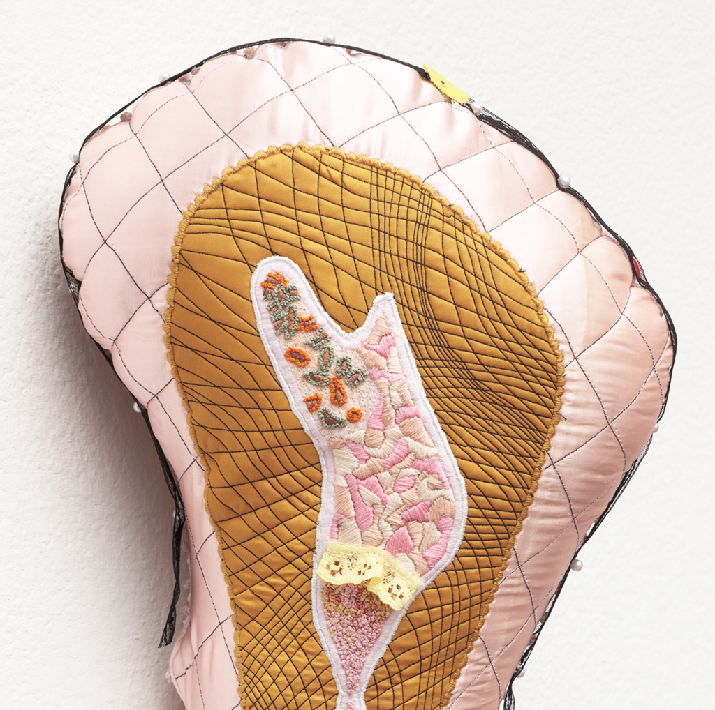 Machine-quilted satin, lace, pear pins, push pins, embroidery floss, fabric dye, hand-dyed yarn, spray paint, wire, plastic charm, elastic, sequin fabric, vintage chenille