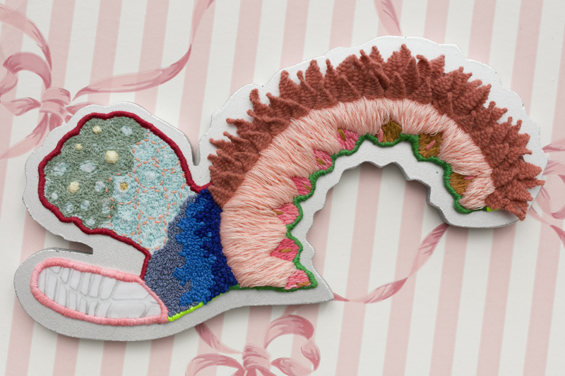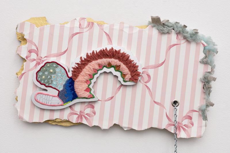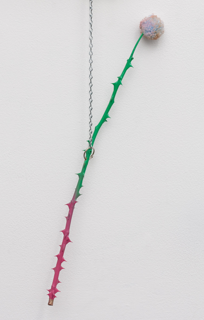 Embroidery floss, sheer nylon, pencil, drywall, wallpaper, mdf, spray paint, acrylic paint, Mod Podge, used Swiffer duster, pom pom, dressing pins, found rose branch, chain