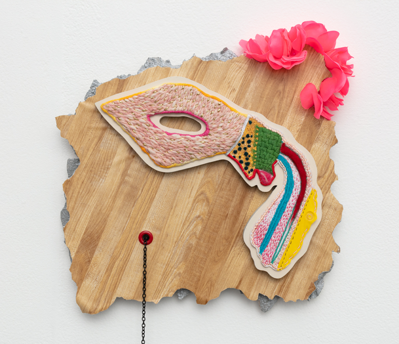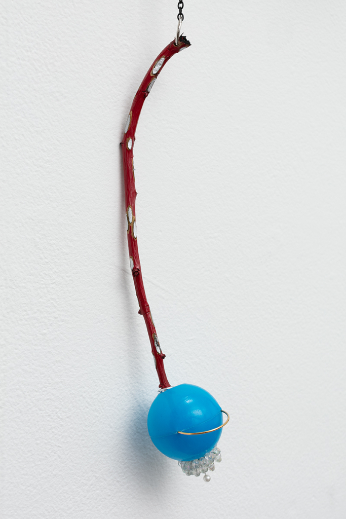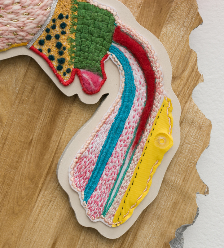 Embroidery floss, yarn, fabric dye, gold cord, plastic sheeting, wool, mdf, spray paint, acrylic paint, Mod Podge, contact paper, silk flower petals, dressing pins, chain, plastic ball, earring