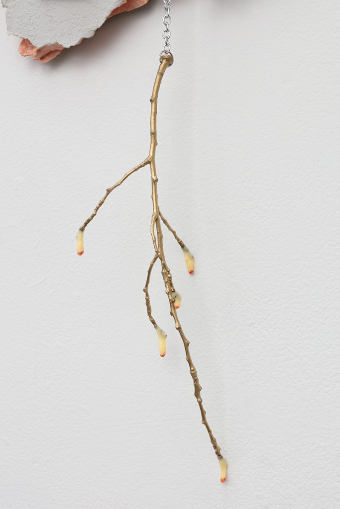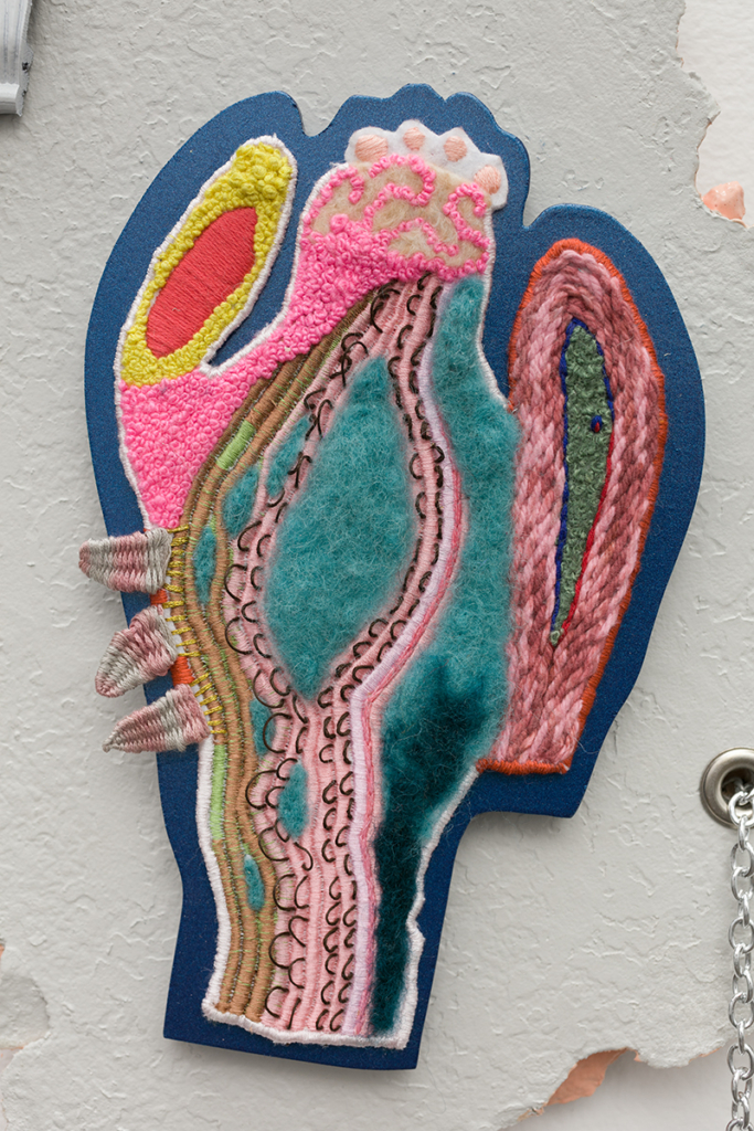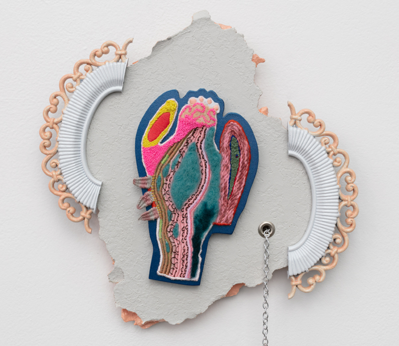 Embroidery floss, wool, thread, wooden frame, drywall, mdf, spray paint, acrylic paint, polymer clay, Mod Podge, chain, found tree branch, marker