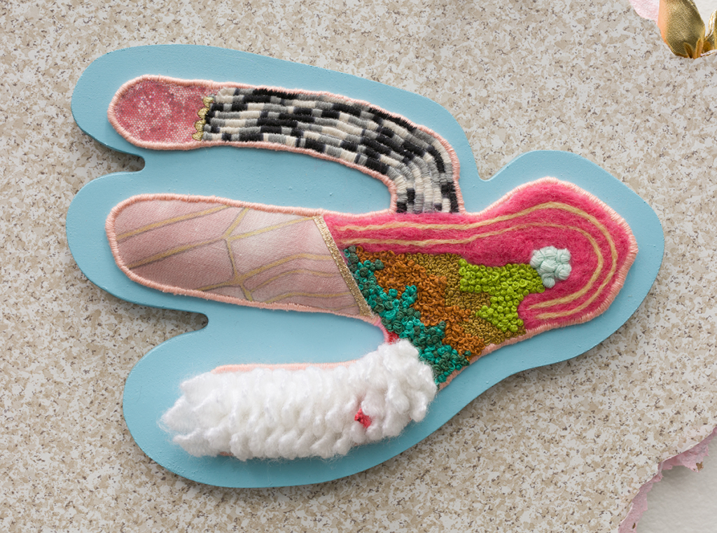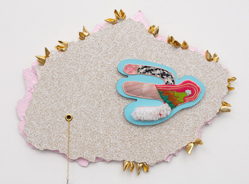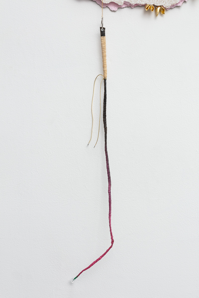 Embroidery floss, yarn, drywall, mdf, contact paper, acrylic paint, Mod Podge, gold, lamé, dressing pins, chain, found branch, plastic bulb, gold cord, rubber bands