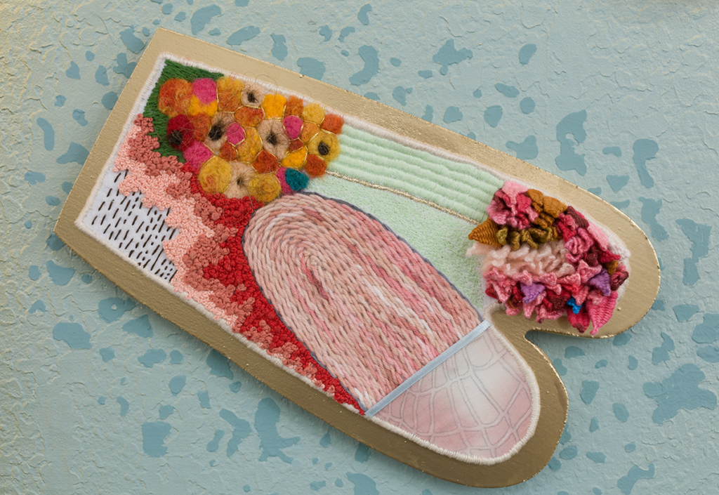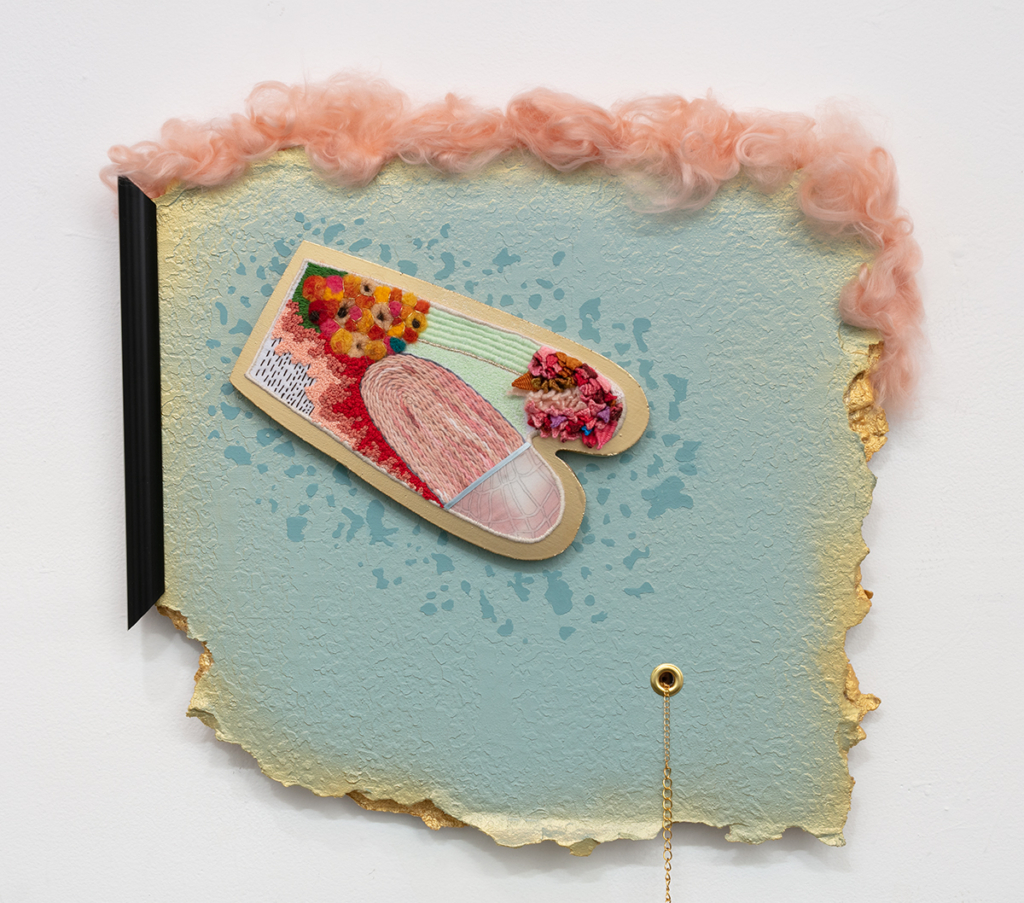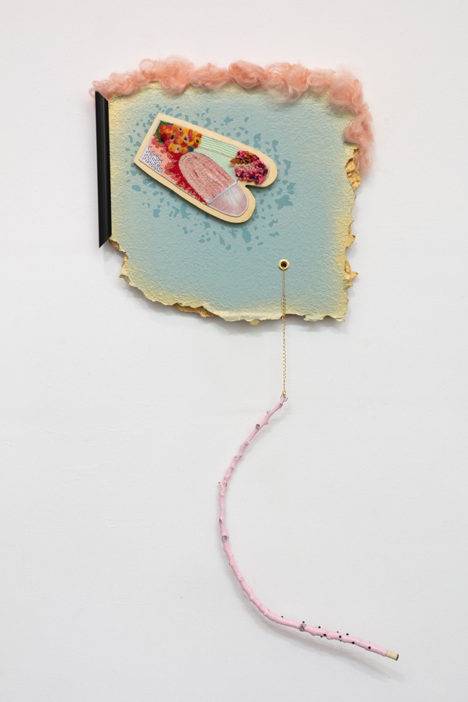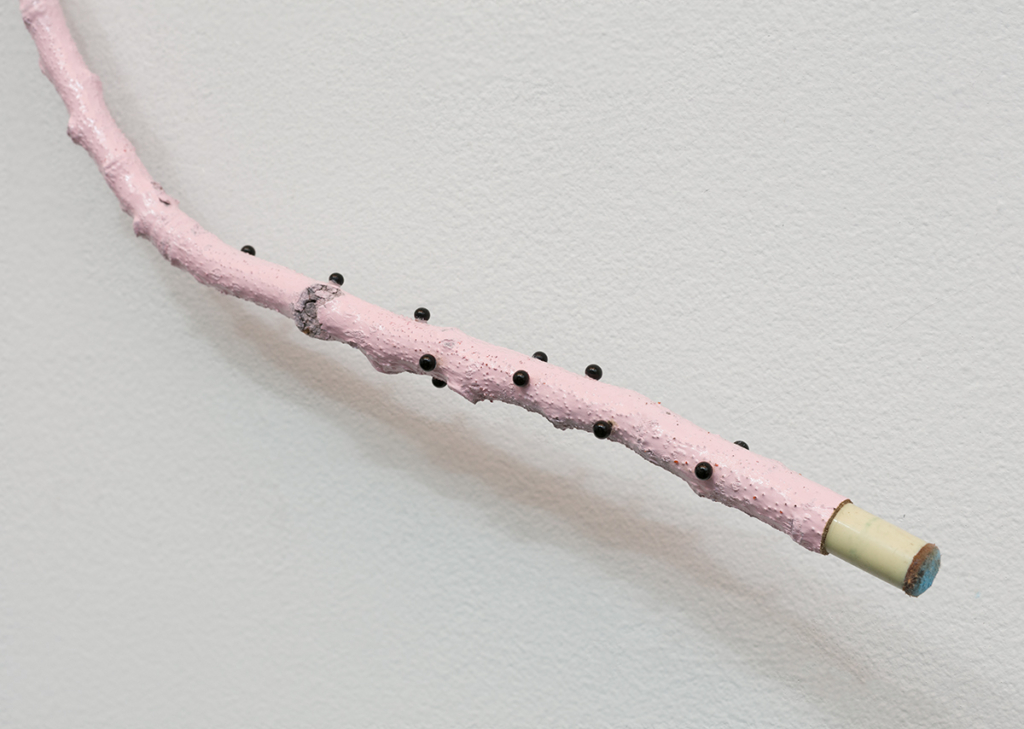 Embroidery floss, wool, human hair, drywall, mdf, spray paint, acrylic paint, latex paint, Mod Podge, acrylic yarn, dressing pins, found tree branch, pool cue tip, chalk, chain, plastic frame