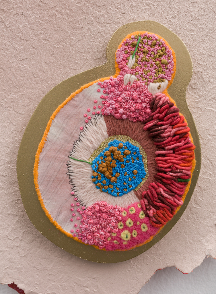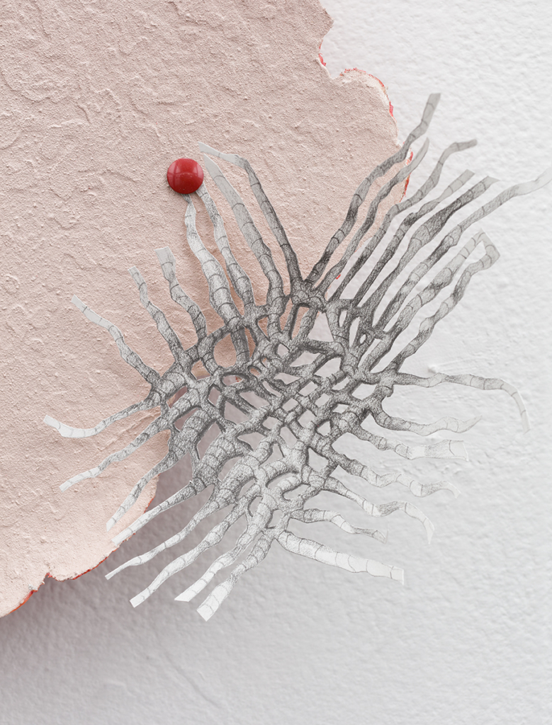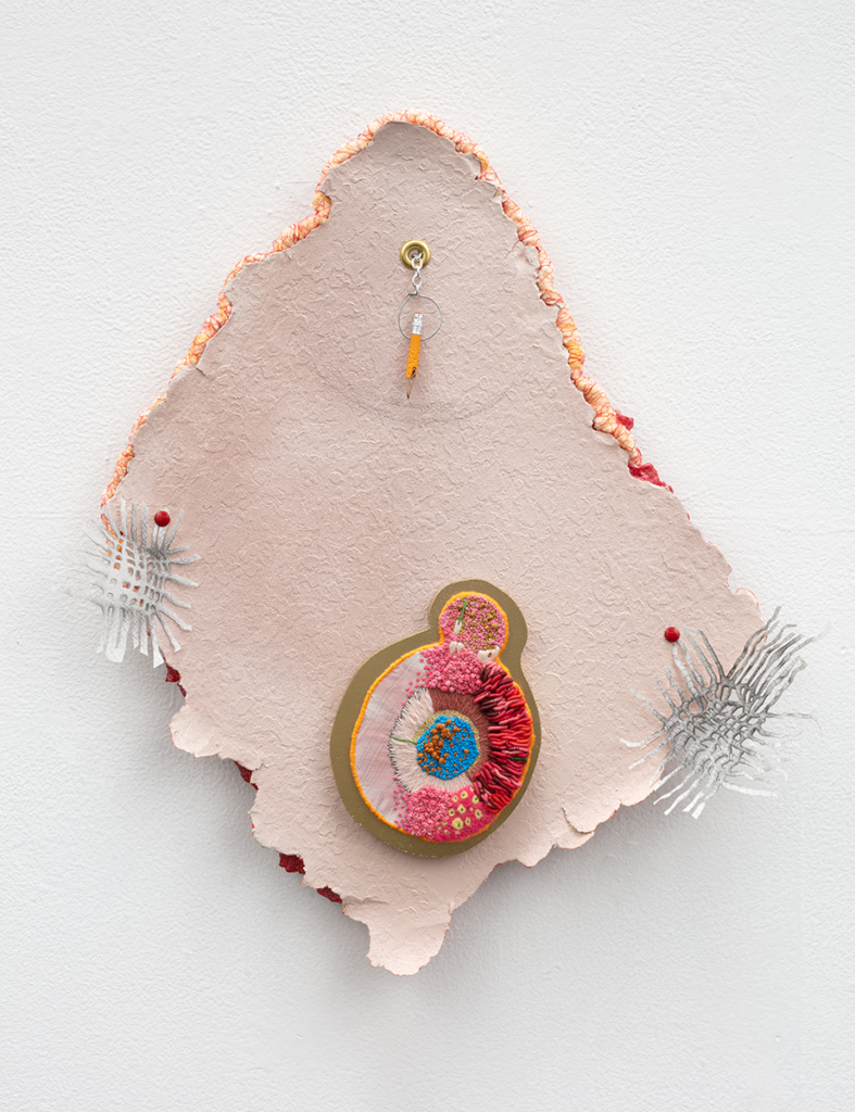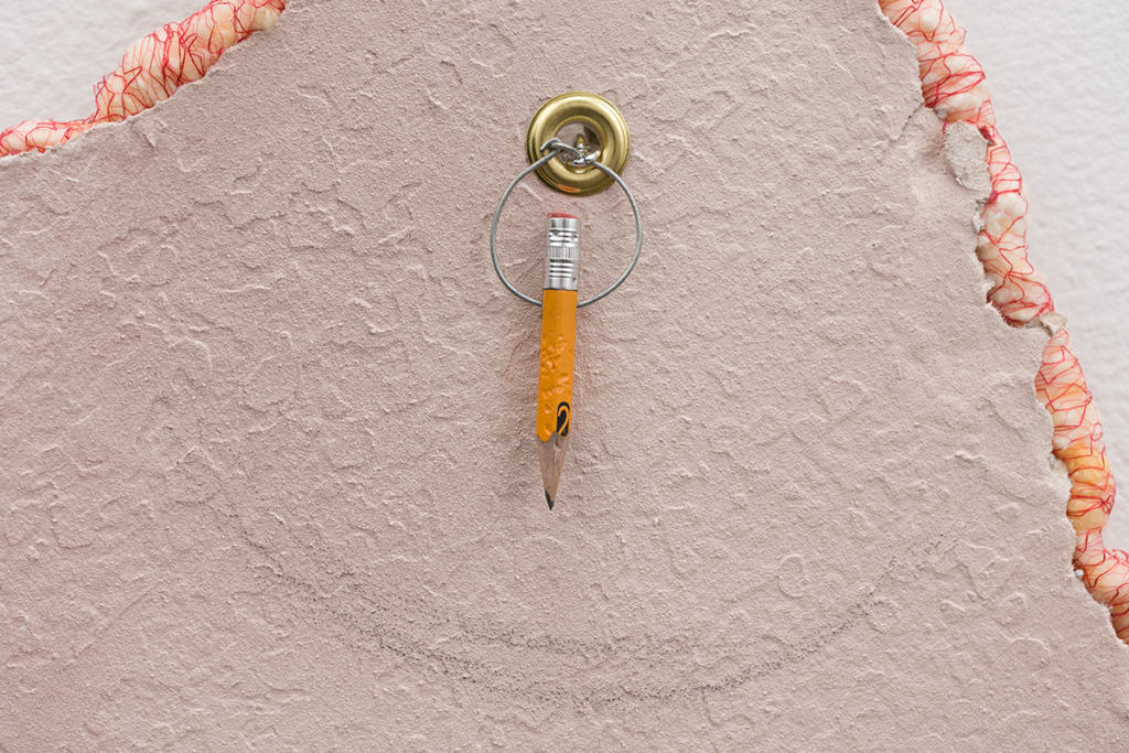 Embroidery floss, drywall, spray paint, cotton balls, fabric dye, fruit netting, cotton fabric, wool, pencil, chain, acrylic paint, Mod Podge, dressing pins, push pins, paper, pencil