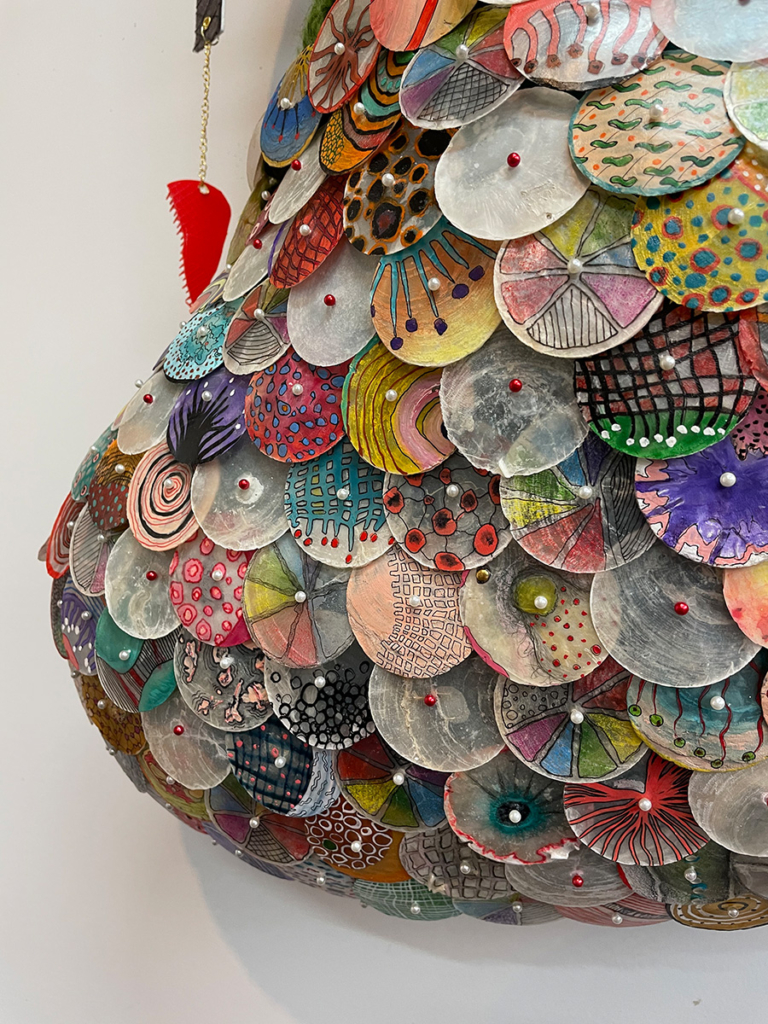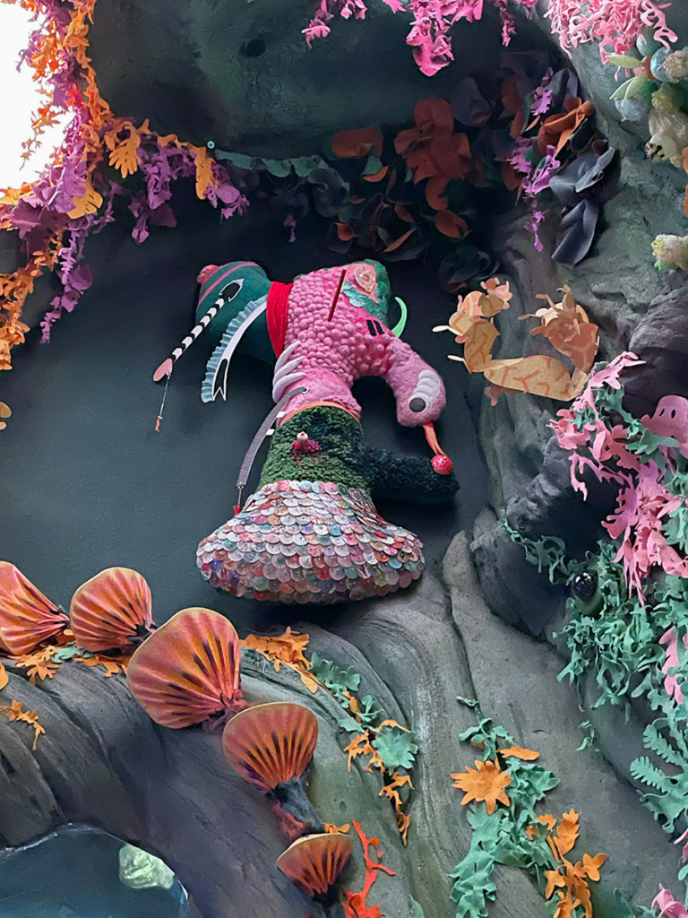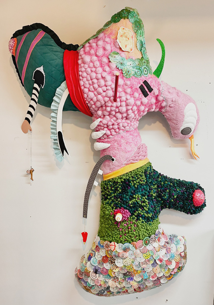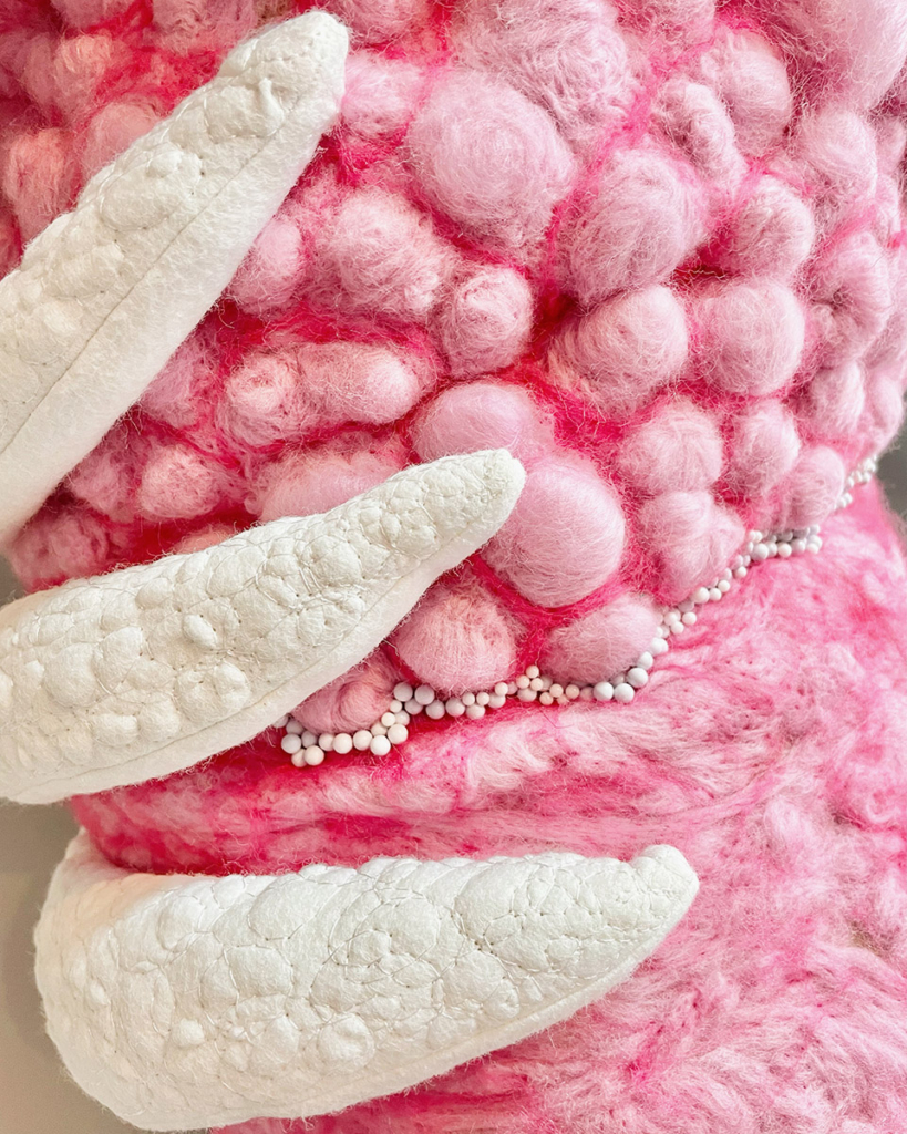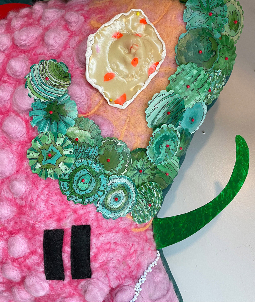 Sculpture for Numina, one of the worlds in Meow Wolf’s Convergence Station immersive art experience. Wool, velour, capiz shells, acrylic paint, pvc foam board, wool yard, dressing pins, felt, fabric dye, polymer clay, jewelry chain, thread, various found objects