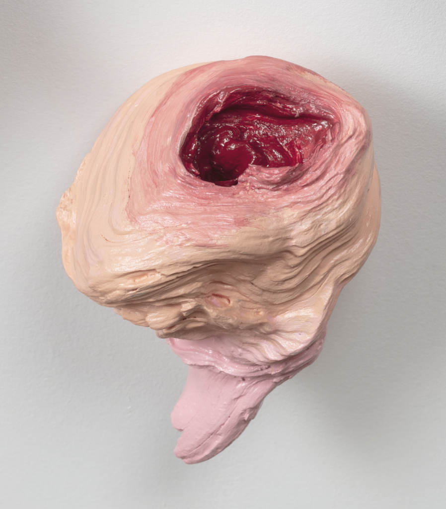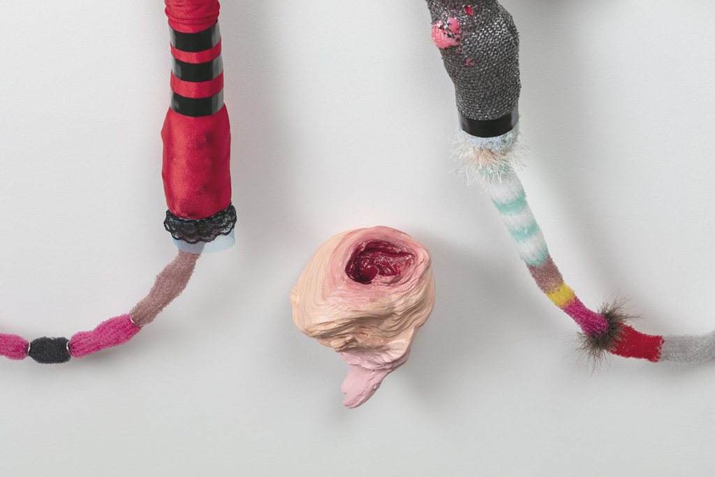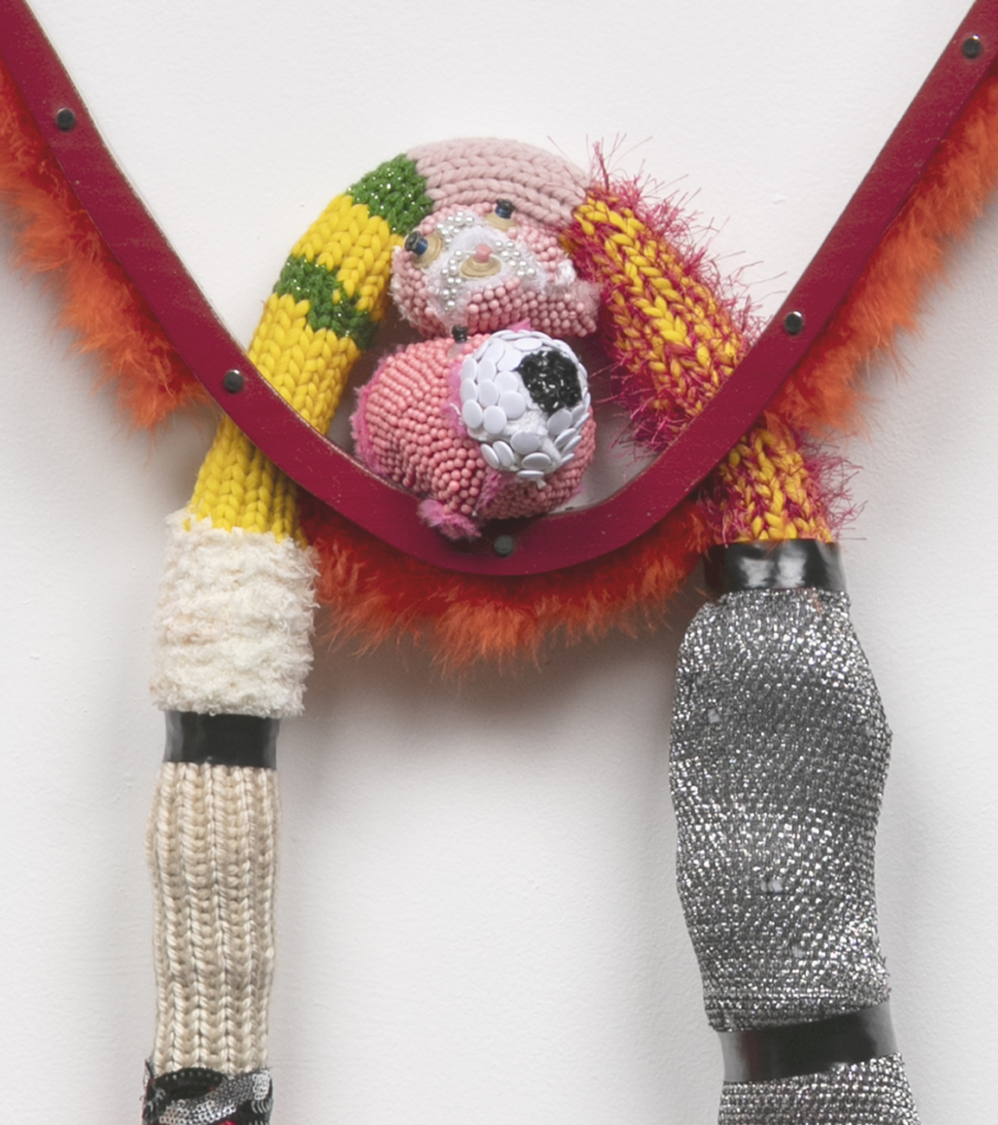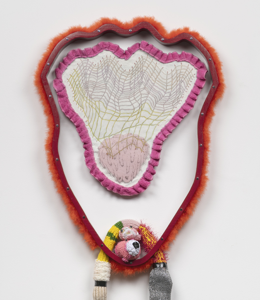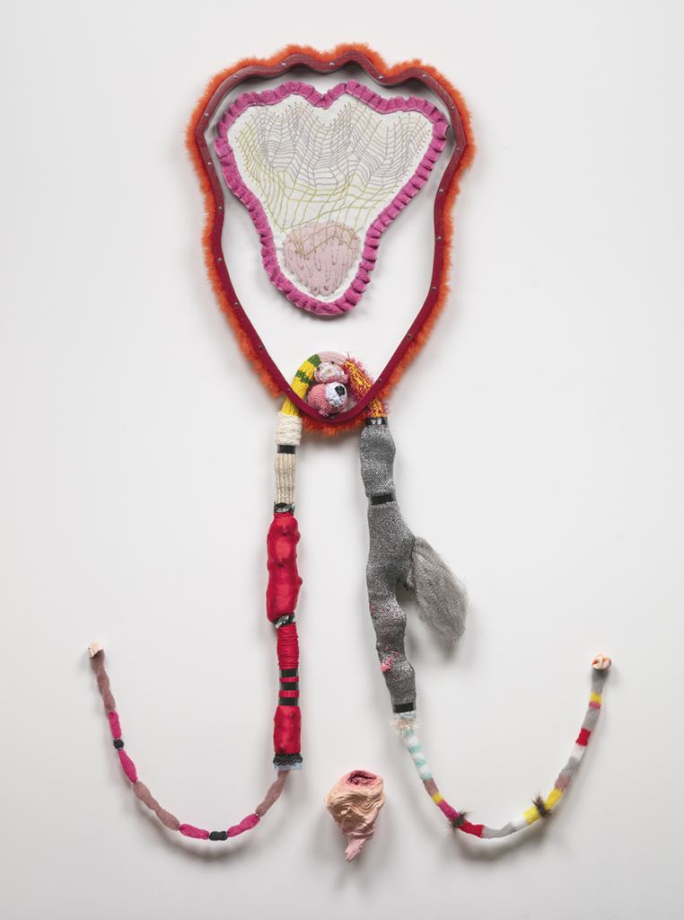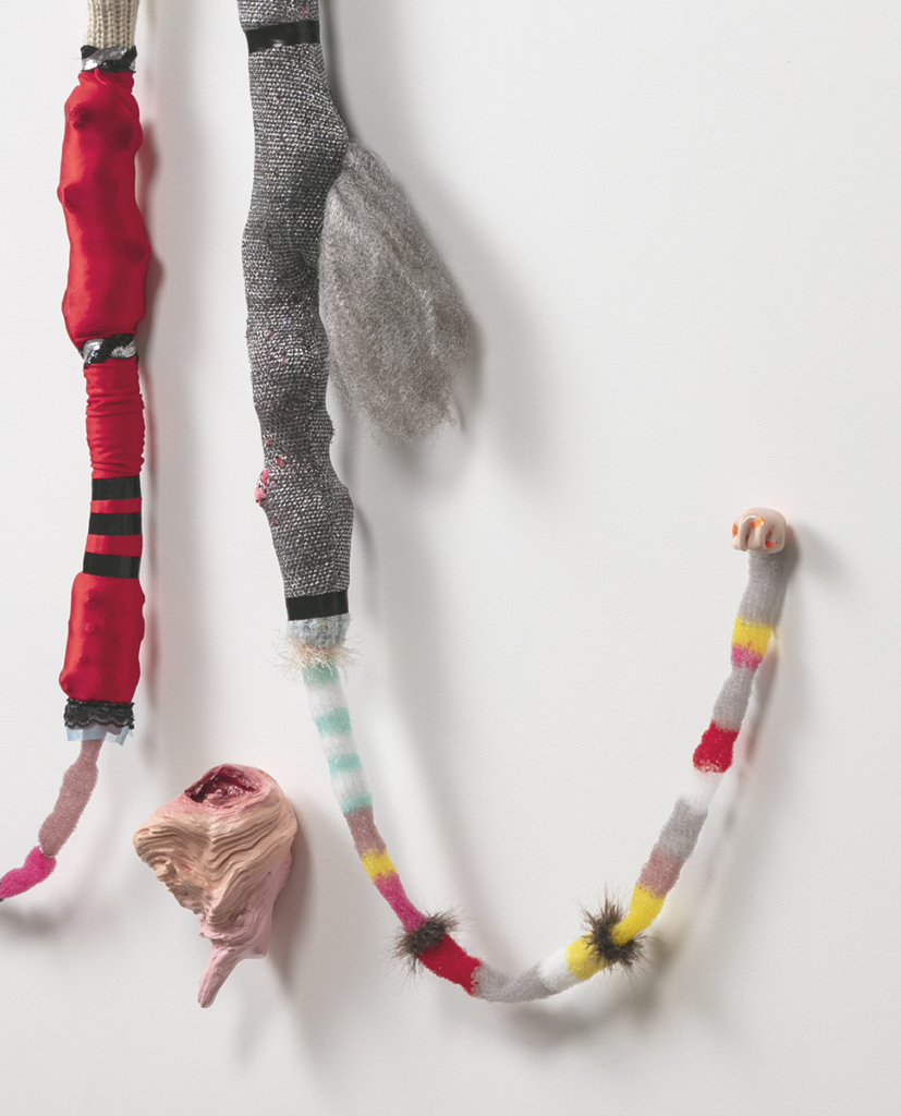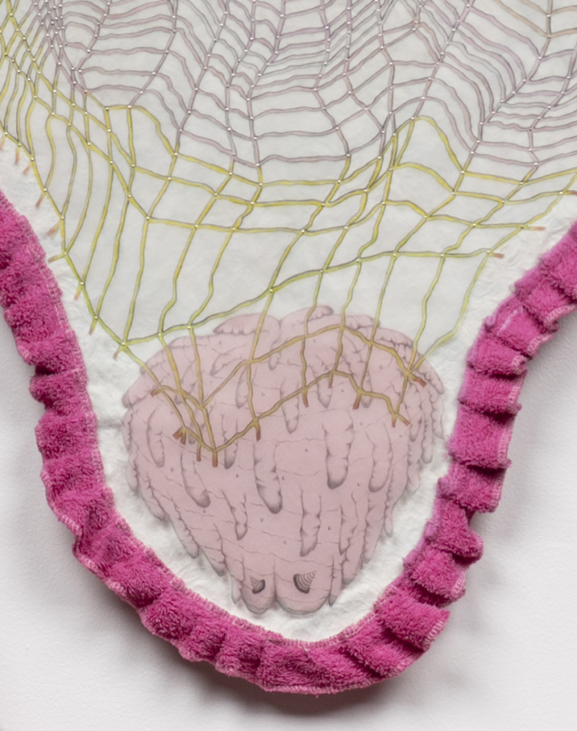 Pencil, colored pencil, tracing paper, vellum, wood, drywall, vinyl tablecloth, used bath towel, dressing pins, stuffed animal heads, thumb tacks, Lycra, nylon yarn, acrylic yarn, polymer clay, driftwood, latex paint, acrylic paint, Mod Podge, feather boa, rhinestones, sequins, electrical tape, lace trim, synthetic hair