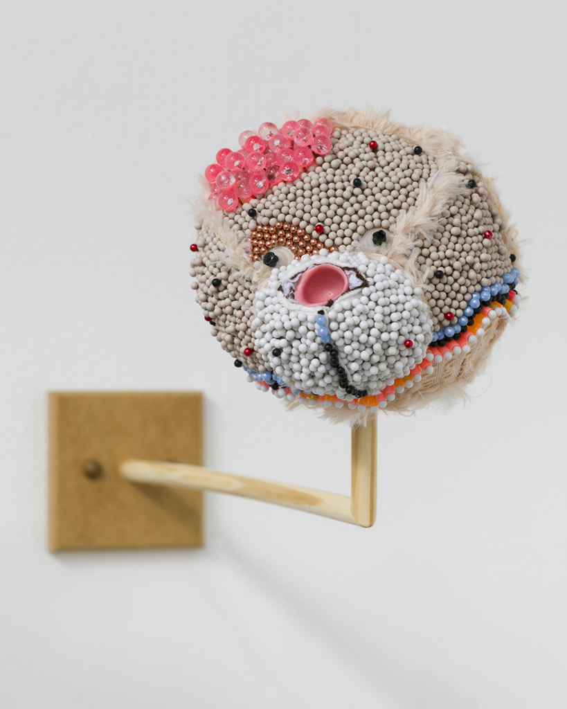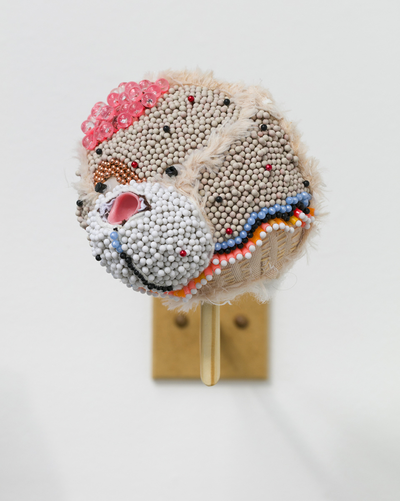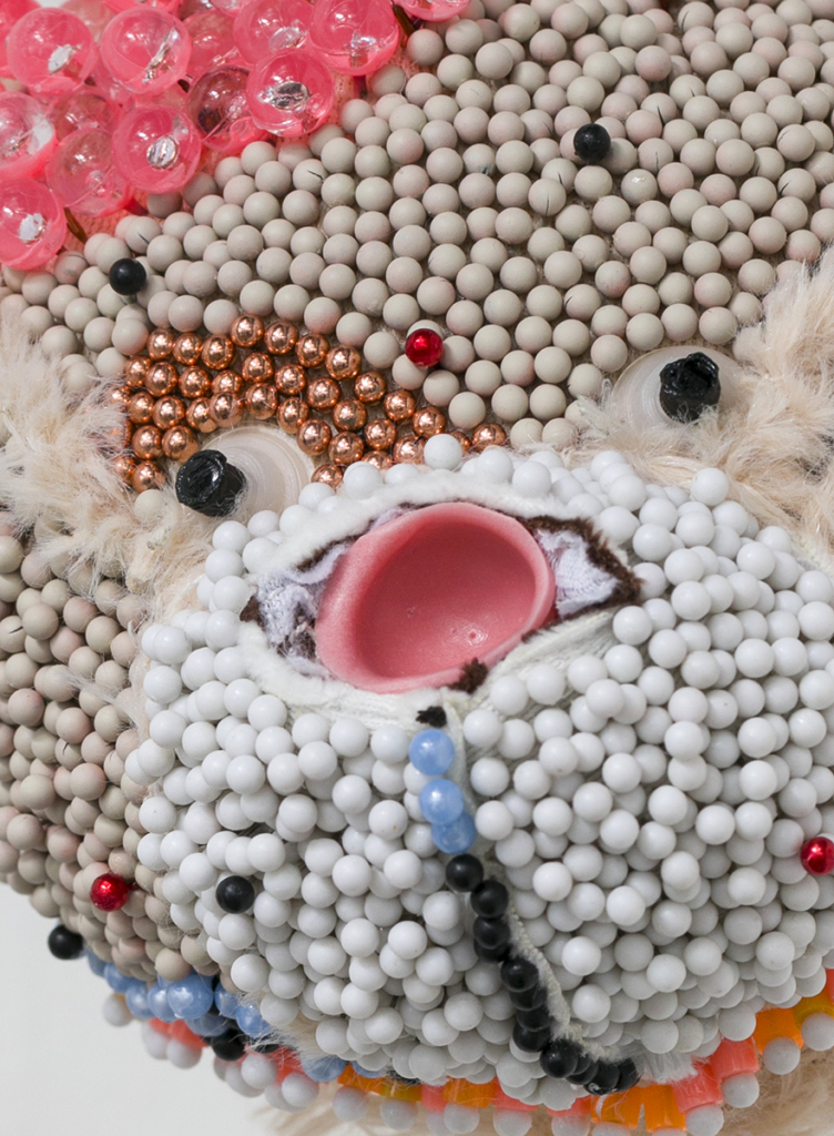 inverted stuffed animal head, map pins, dressing pins, oversized map pins, paint, Perler beads, wooden beads, thumb tacks, plastic doll part, Polyfil, wood