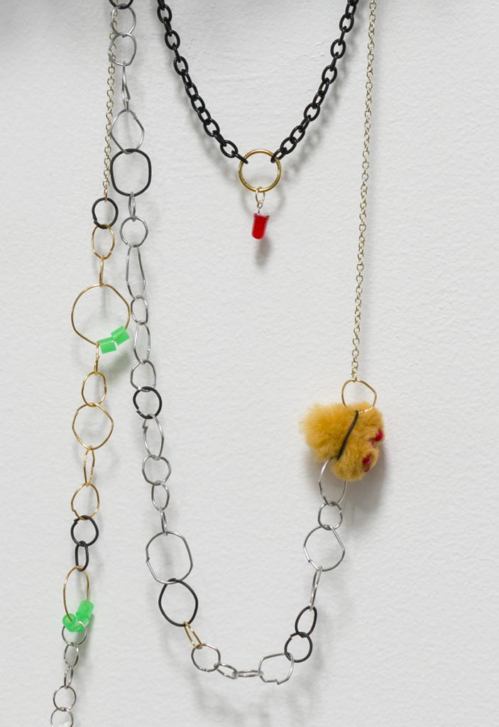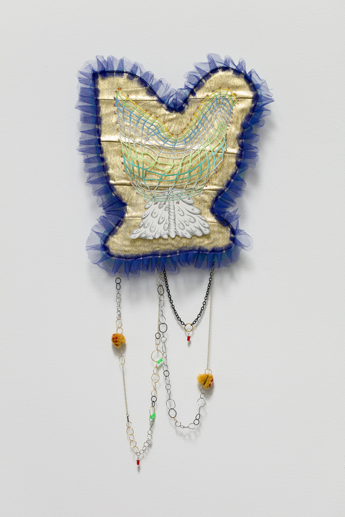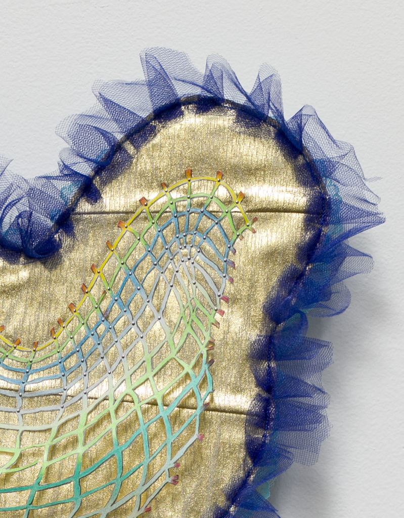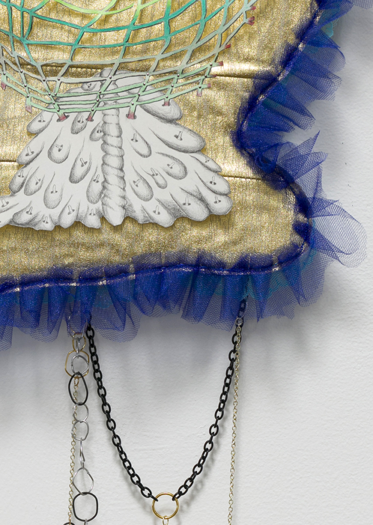 gold lamé, tulle, lace, thread, interfacing, paper, graphite, colored pencil, sequin pins, steel wire, jewelry chain, pom poms, map pins, jewelry findings, found objects, acrylic paint, drywall