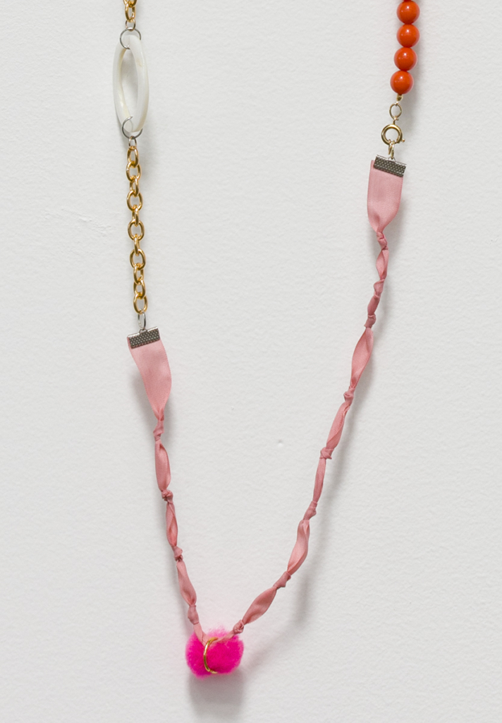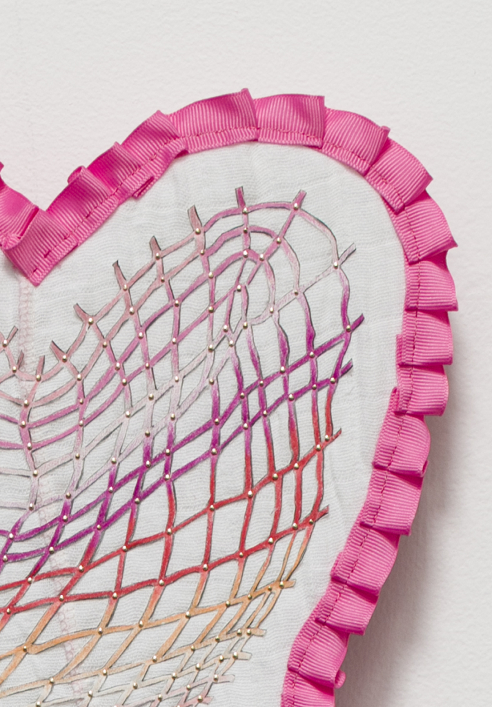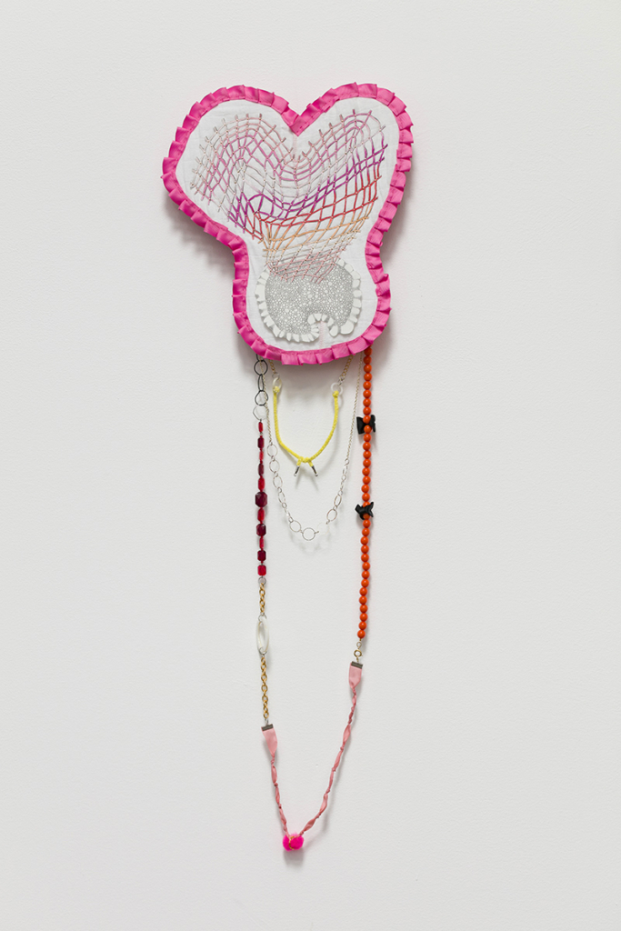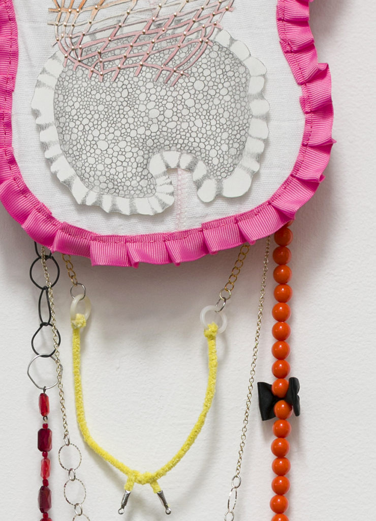 flannel bed sheet, ribbon, thread, interfacing, paper, graphite, colored pencil, sequin pins, steel wire, costume beads, jewelry chain, jewelry, findings, vintage pipe cleaner, found, objects, acrylic paint, drywall